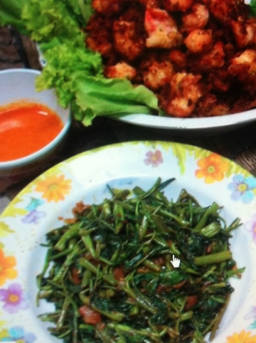 辣味刺鼻时,倒入空心菜(kangkong)旺火翻炒菜软透味。
