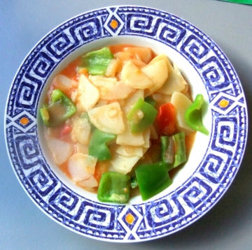2,热锅热油放入葱,炒香后放入土豆片,炒几下后放入西红柿,翻炒后放些水盖盖儿煮3-5 分钟,直至土豆熟软,汁儿减少基本收干。根据个人口味放入盐,糖和鸡精,再放入青椒,翻炒几下出锅。