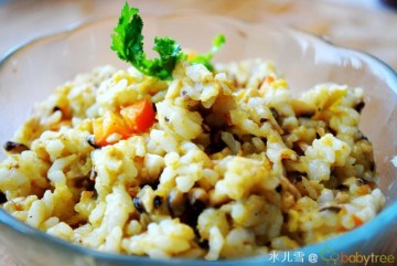 1、将清水、鸡汤放入锅中煮沸,加入米饭和少许盐后,煮20-25分钟至米饭变软后沥干待用。同时烤箱180℃预热。