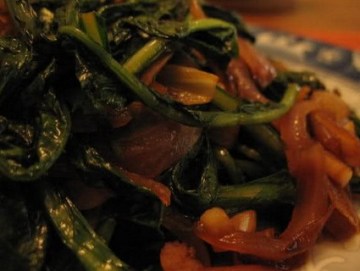 嫩蒲公英叶,黄洋葱丝,蒜末,干香菇泡好挤干水切丝,姜丝,油,酱油,苹果醋