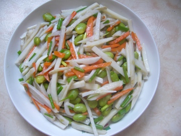 芋艿,胡萝卜,毛豆,葱,盐。