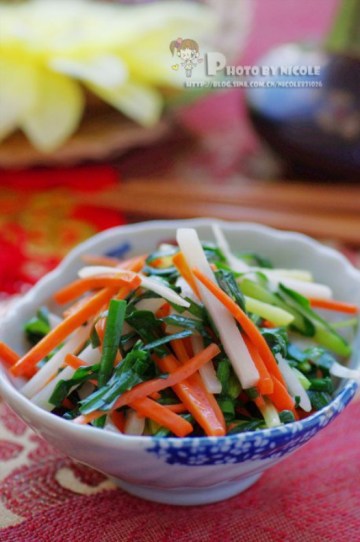 韭菜150g,芹菜2根,胡萝卜1个,春笋1个,糖1/2茶匙,盐1/2茶匙,味精1/4茶匙