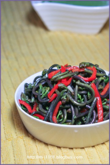 1.鸡爪菜洗净在开水锅里烫一下捞出沥干水分备用。红辣椒切丝