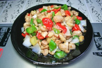 4.另起一锅加底油烧热放葱姜炸香倒入炸好的鸡丁,青红辣椒和洋葱加蚝油,盐,糖,湿芡粉翻炒一会出锅装盘