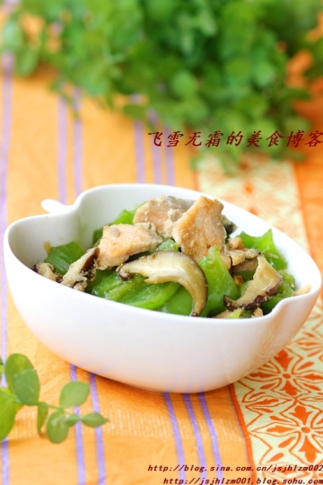青椒200克,挪威三文鱼100克,香菇1个,葱10克,姜10克,白糖1茶匙5克,生抽1汤匙15ml,香油1茶匙5ml