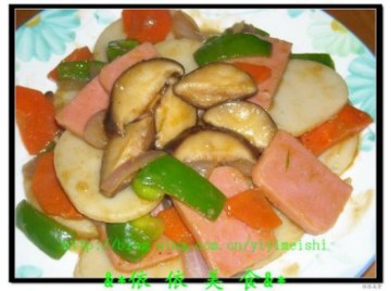 4.加入炒熟的火腿、胡萝卜、冬菇、青椒炒匀,加入1汤匙的蚝油,用水淀粉做个薄芡就可以装碟