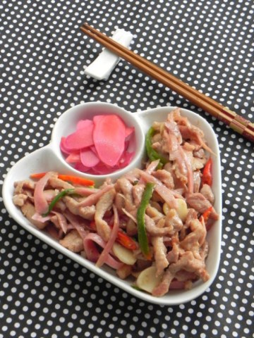 5.锅留底油爆香蒜片,青红椒,下肉丝,调入盐,下梅渍仔姜丝