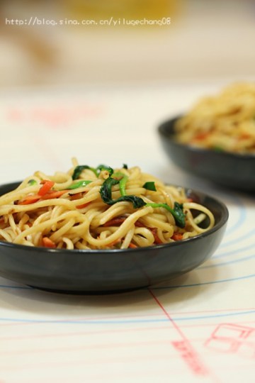面条,胡萝卜丝,香肠丝,包菜丝,油,盐,味精,一品鲜酱油,青葱