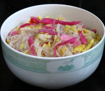 2、开锅,热油,先把娃娃菜和泡菜倒锅里略炒然后加进米粉继续炒,下味料,差不多好时加进蛋丝拌匀。装盘,可以吃了。早餐连同午饭就这样对付过去了。