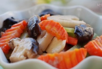 2、莲藕、莴笋切片,胡萝卜切花,马蹄去皮切片或者直接买去好皮的回来切,新鲜香菇切片后汆一下水。