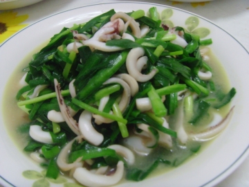 主料:新鲜小鱿鱼1磅,韭菜150克。