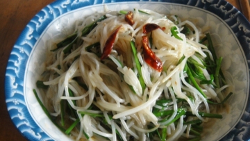 绿豆芽500克.韭菜适量.干红椒3根.盐.糖.白醋.鸡精.淀粉.水少许