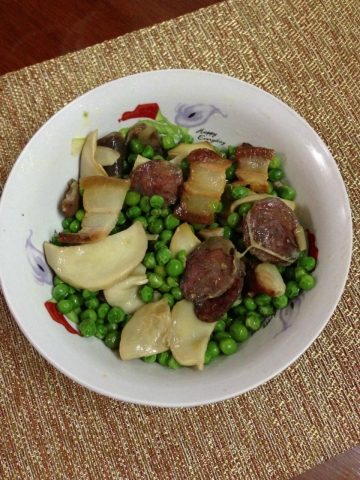 2、腊肉切片+青豆入油锅小炒一下,加水盖锅盖,焖3分钟的样子;