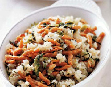 干豆腐50克,白米饭100克,油7.5毫升,味精0.5克,香葱3根,红萝卜丝少量,盐、酱油各1小匙。