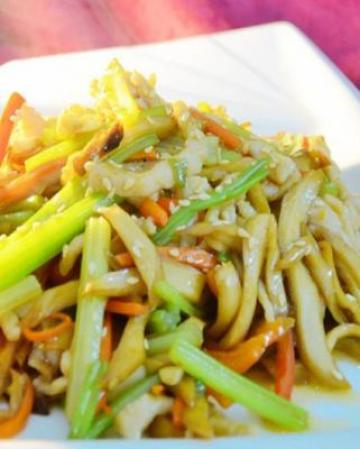 芹菜炒肉片、炒墨鱼仔、藕条炒木耳、豆泡炒芹菜红萝卜、香肠炒紫甘蓝卷心菜