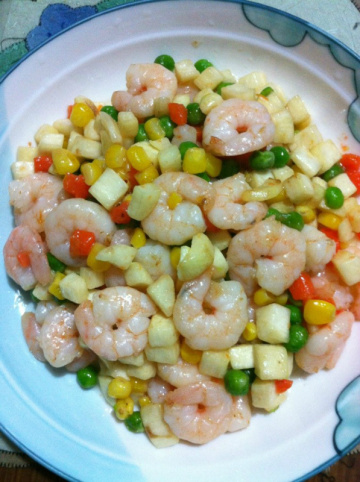 虾仁先腌制一下 淀粉 胡椒粉 料酒 蛋清 盐 三丁煸炒 再倒入虾仁翻炒 味精 糖 即可
