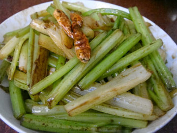 主料:芹菜500克,蒜2瓣,花椒4-5粒,干红辣椒2-3个