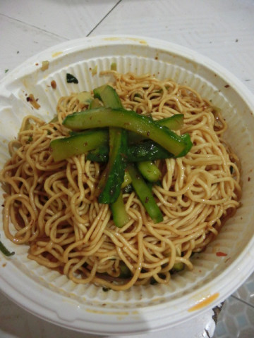 2、等面体焖到自己喜欢的软硬度后,把水倒出,然后把摊凉的小青瓜段平铺在面体上,然后将酱料包均匀的倒在小青瓜上面,然后慢慢的,有耐心的把面体和小青瓜段搅拌在一起~~就可以享用咯!