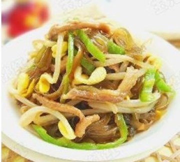 豆芽,粉条,肉丝,海带,青椒,葱,姜,生抽,料酒,生粉