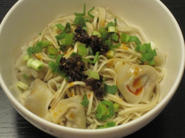 冷凍小餛飩8顆,麵條1人份,香油1.5匙,辣椒油1.5小匙,蔥半支,麻辣香鍋調料1.5小匙