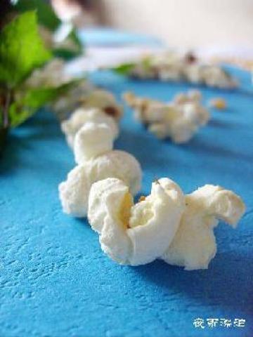 1.锅中加入黄油,小火热化后加入玉米粒,盖上盖子,大火,一只手按住盖子,另一只手端起炒锅不停摇动(离火约有1厘米左右的距离),大概1分钟就可以听到劈啪劈啪的声音。