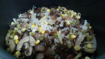 2、然后与玉米粒、青豆粒、虾米、大米,加酱油或盐一起搅拌均匀后煲饭即可。