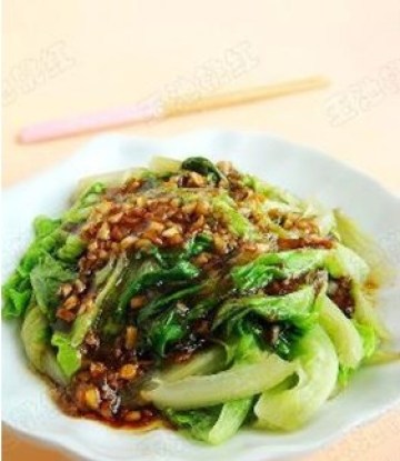 2.姜蒜爆香油锅,下生菜爆炒片刻以后加入适量的盐 、鸡精和2茶匙鲍鱼汁爆炒上色后撒上适量的麻油翻炒几下即可装盘。