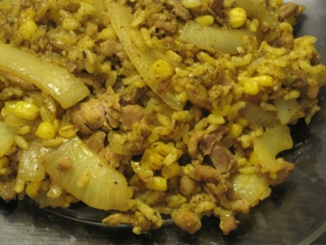 肉絲半盒(120g),隔夜米飯1.5碗,蒜2瓣,洋蔥3分之1顆,玉米粒1小碗,咖喱粉3匙,鹽適量,橄欖油一點點,醬油1匙,料酒1.5匙,十三香粉1小匙,黑胡椒粉適量,黑胡椒碎一點點,香油1.5匙