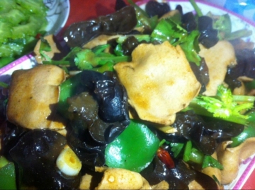 三丝爆豆、菠菜炒蛋、香菇爆炒大闸蟹、青椒炒平菇、黑木耳炒青馍糍