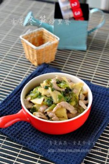 4.倒入雪菜一起翻炒片刻,加少量水稍煮一会儿