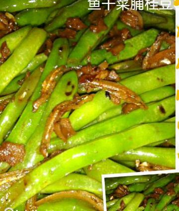 四季豆300g,江鱼仔干40g,甜菜脯和咸菜脯各20g,蒜茸半汤匙