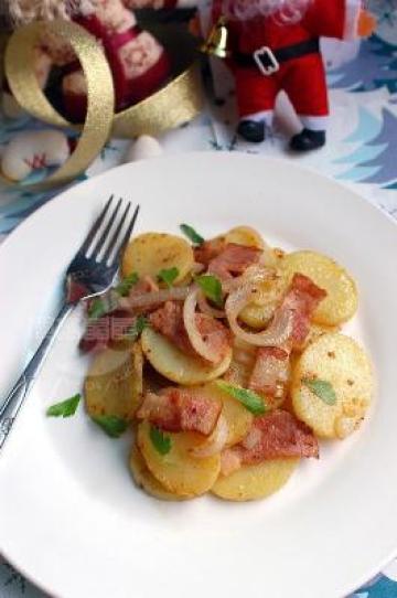 4.锅中放洋葱煸炒片刻,再加土豆煸炒,至洋葱身软,土豆外表金黄黄时加少许盐和胡椒粉,放入培根炒匀出锅装盘,撒芹菜叶