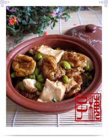 2.放一点糖.加水/蚝油/酱油/和毛豆(我先用八角和盐煮熟的)一起煮开后转入沙锅中慢煲几分钟.