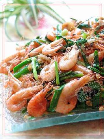 青虾洗净,韭菜洗净。切段。先将素油煸炒青虾,烹黄酒、酱油、醋,姜丝等调料,再加入韭菜煸炒,嫩熟即可。