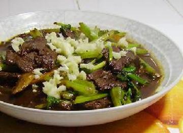 牛肉50克,芹菜150克,植物油10克,精盐、料酒、葱各适量。