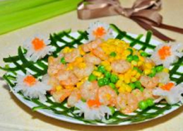 3、炒锅烧热放油,放入虾仁快速滑散变色,加入青豆、玉米粒、少量盐 味精 翻炒均匀即可。