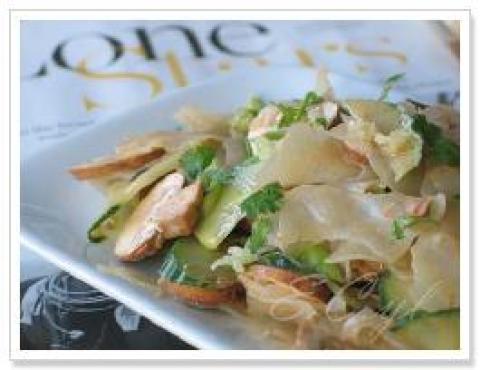 3.把粉皮,黄瓜,和白蘑菇(在这时切片,太早蘑菇会变色)一个大容器里,倒入芝麻