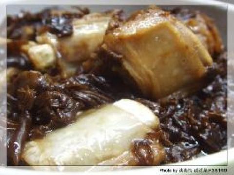 排骨半斤,干酱菜100克,生姜半块,生抽2大匙
