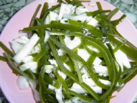 1.白菜洗净切成细丝,海带洗净煮熟后切细丝,加入适量精盐拌匀,腌制半天。控干腌制出的水份。
