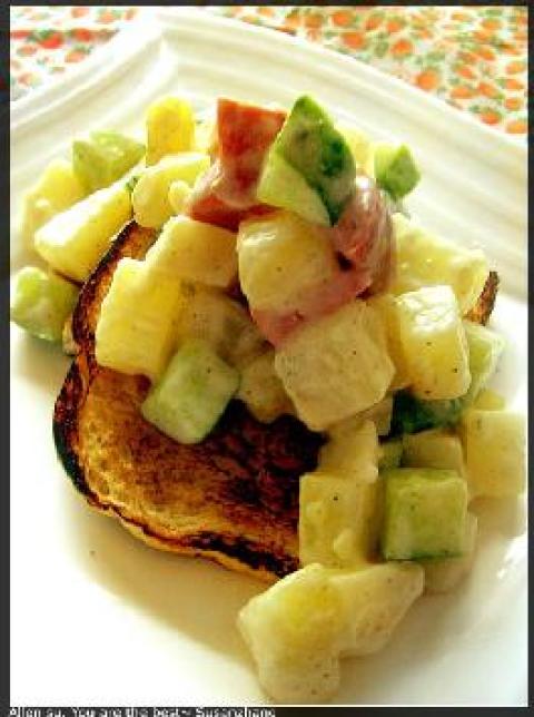 土豆,橄榄油,黄瓜,火腿红肠,沙拉酱,醋,白胡椒粉,盐