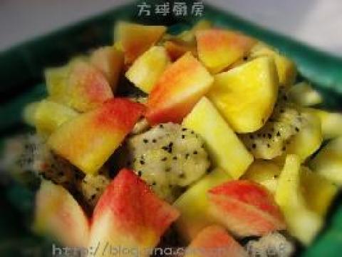 香瓜一个,火龙果半个,香蕉,桃一个,鸡蛋,芥末,盐,橄榄油,白醋,白胡椒粉