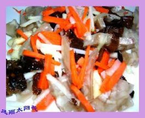 1、皮冻切条,胡萝卜、木耳、青木瓜切丝;