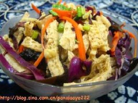 1.木耳用开水炒熟.将脆豆腐、紫甘蓝、胡萝卜、木耳切丝.脆豆腐本身就是熟的可以直接食用.