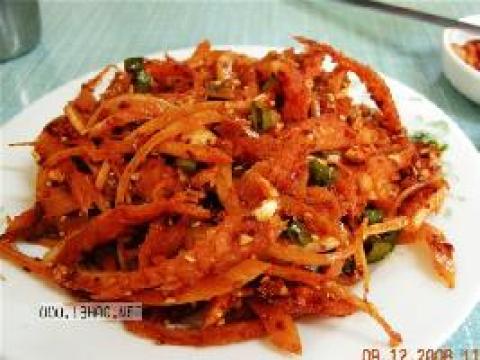 1.泡发好买来的桔梗丝大概(一晚上的一时间),洗净后,用手揉搓,使之柔韧。