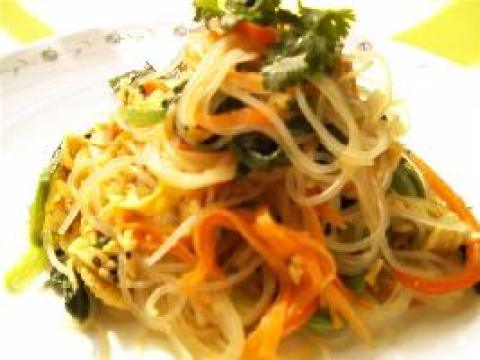 1.1.准备好原料 2.鸡蛋打散,锅中放少量油,煎成蛋饼,备用 3.胡萝卜,红椒,鸡蛋饼切丝 4.锅中烧热水,放胡萝卜红椒丝烫一分钟捞起 5.粉丝放锅中烫半分钟捞起,放凉开水中冲洗后沥干水份 6.锅中滴一滴油,放入菠菜烫一分钟后捞起,控干水份 7.葱姜蒜切成末,放味达美,醋,白糖,黑白芝麻于碗中,锅中烧热香油,浇在碗中,即成了调料 8.将所有的材料混合均匀,倒入调料即可
