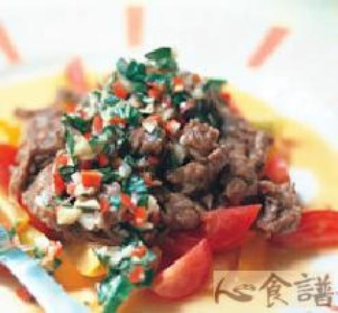 3.将作法1的小红蕃茄与小黄蕃茄铺在盘底,放上作法2的牛肉片,淋入作法1的调味汁即可。
