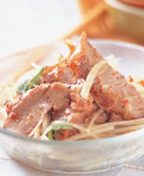 1.将沙朗牛肉撒少许盐,以小火煎,每面各3分钟,至八分熟,切成5㎜的薄片备用。