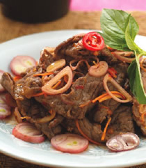 牛肉片300公克,红葱头40公克,柠檬1/4颗,红辣椒1根,鱼露1小匙,辣椒酱1小匙,细砂糖2小匙