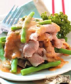 4.作法1的四季豆、作法2的梅花肉片盛入盘中,将作法3的调味料淋入即可。