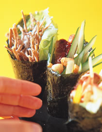 9.将海苔片以小火略烤过,放上适量的寿司饭,再加入作法1、2、3、6中的材料后,从左下角开始捲成圆锥状,再挤上沙拉酱汁装饰即可。